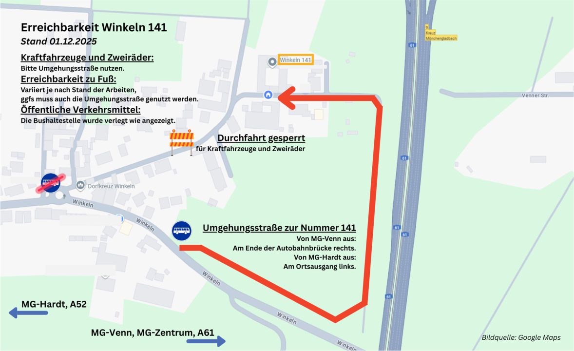 An der Abfahrt MG-Hardt verlassen Sie die A 52 und fahren in Richtung Hardt. Von dieser Straße aus geht nach wenigen Metern die Landstraße links ab nach MG-Winkeln. Sie fahren nun parallel zur A 52 und erreichen den Ort Winkeln.